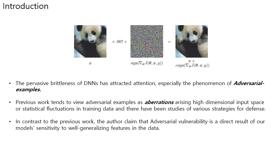 DNN이 adversarial example에 취약하다는 것은 잘 알려져있다. 이전 연구들은 이런 원인이 input space의 high-dims에서 오거나 train data의 통계적인 fluctuation으로부터 발생한다거나, 또는 우리가 사용하는 relu의 positive부분에서 local linearity가 발생해서 공격이 쉽게 당한다. 등 다양한 주장이 있었다. 또한 이러한 attack 을 방어하는 여러 전략들을 다뤄져왔다. 이 논문에서는 인간이 인지 못하는 feautre라도 accuracy에 도움된다면 모델은 활용할것이기에, 이러한 imperceptible한 feature에 대해 민감하게 반응되는 결과에서 adversarial vulnerability가 오는것이다. 라고 말한다.
