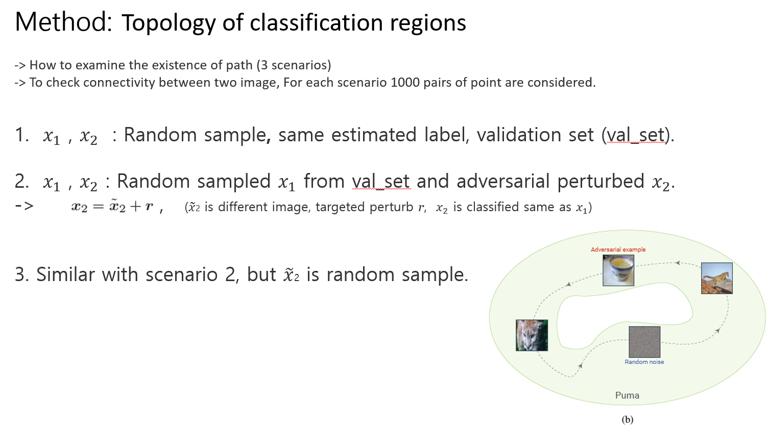 1. With the same estimated label, validation set, Two random sampled point. 2. One random sampled point(x1) from validation set and 1 perturbed image(x2), r is perturbation. $x_{2} = \tilde{x_{2}} + r$ , $\tilde{x_{2}}$ 는 x1과는 다르게 분류되었으나 r을 통해 x1과 같은 regison으로 분류됨 3. One random sampled point(x1) from validation set and perturbed random point. similar scenario 2 but, $\tilde{x_{2}} $ is just random image. |