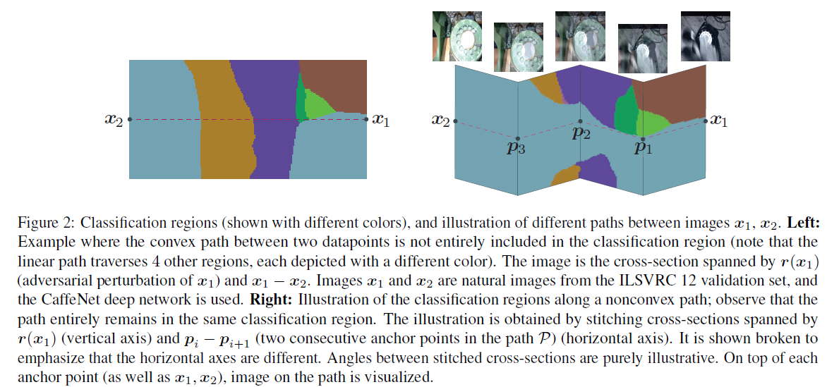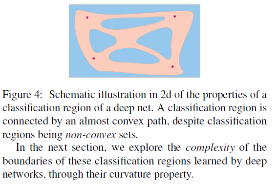 이 결과는 뉴럴넷 region이 그들의 분류 region을 두 이미지 사이에 approximately flat하게 extrapolate한다는 것이다. (예를 들면, 같은 class의 두 이미지 사이 near convex path가 존재함) 하지만 분류 region 전체는 convex body는 아니다. In simplistic 2 d world, this looks like fig 4.