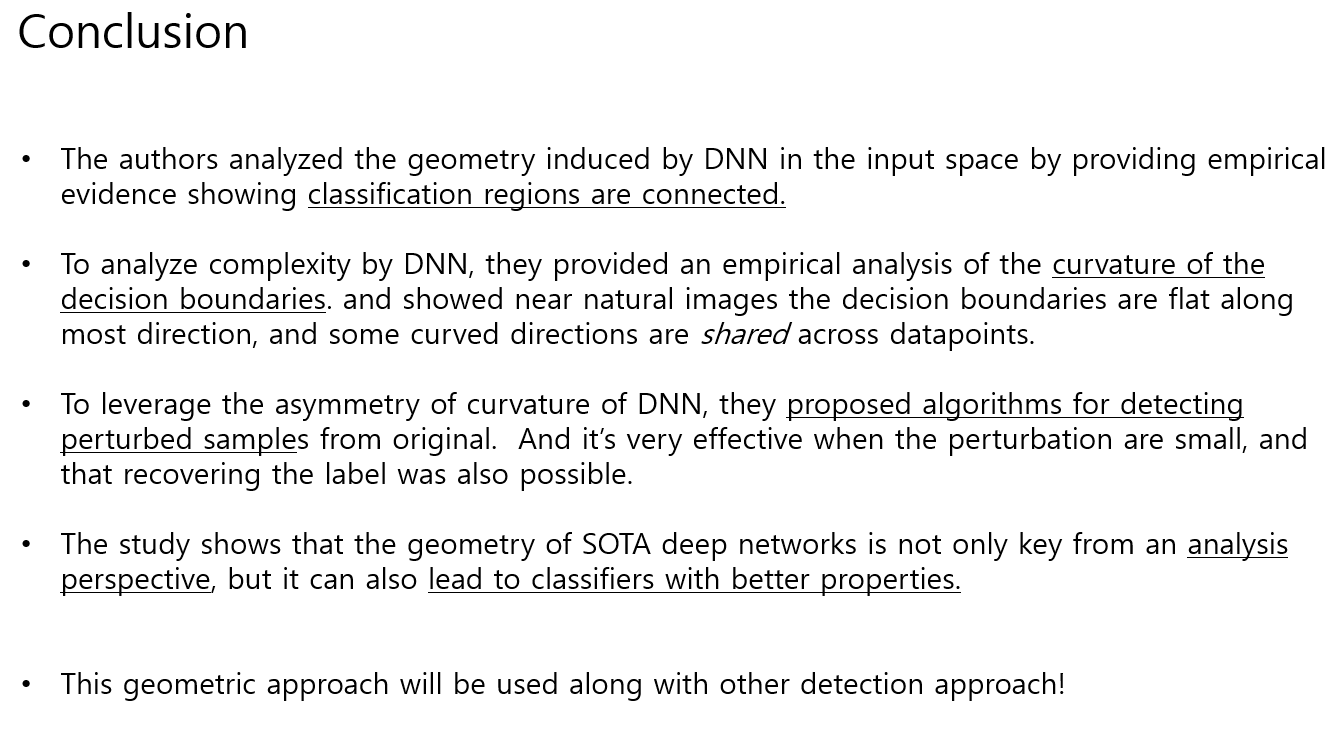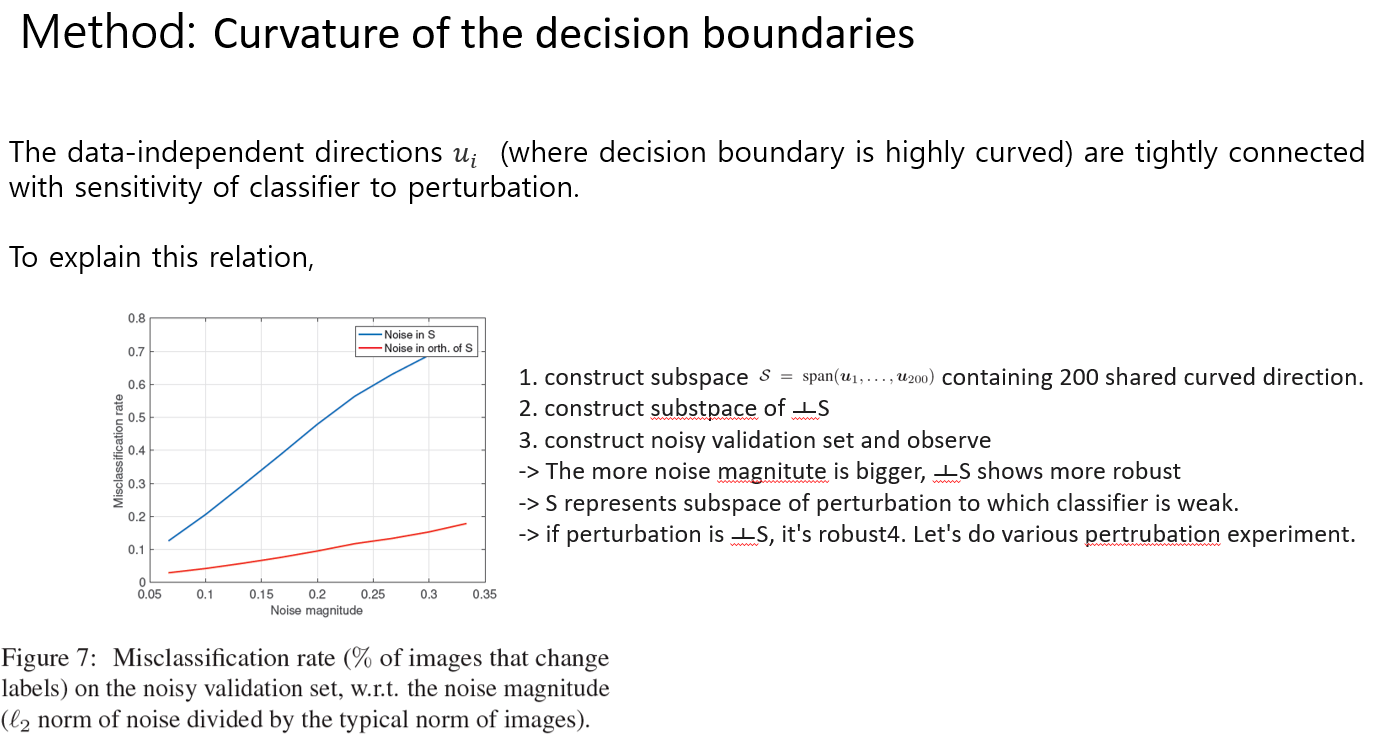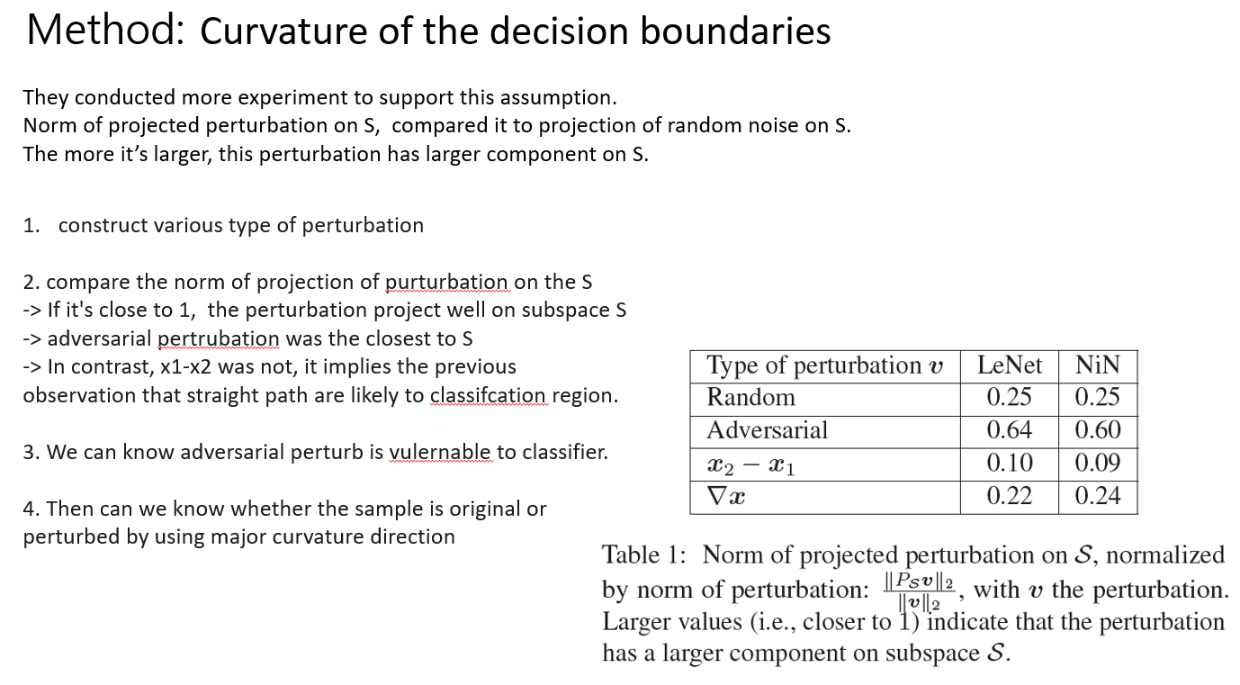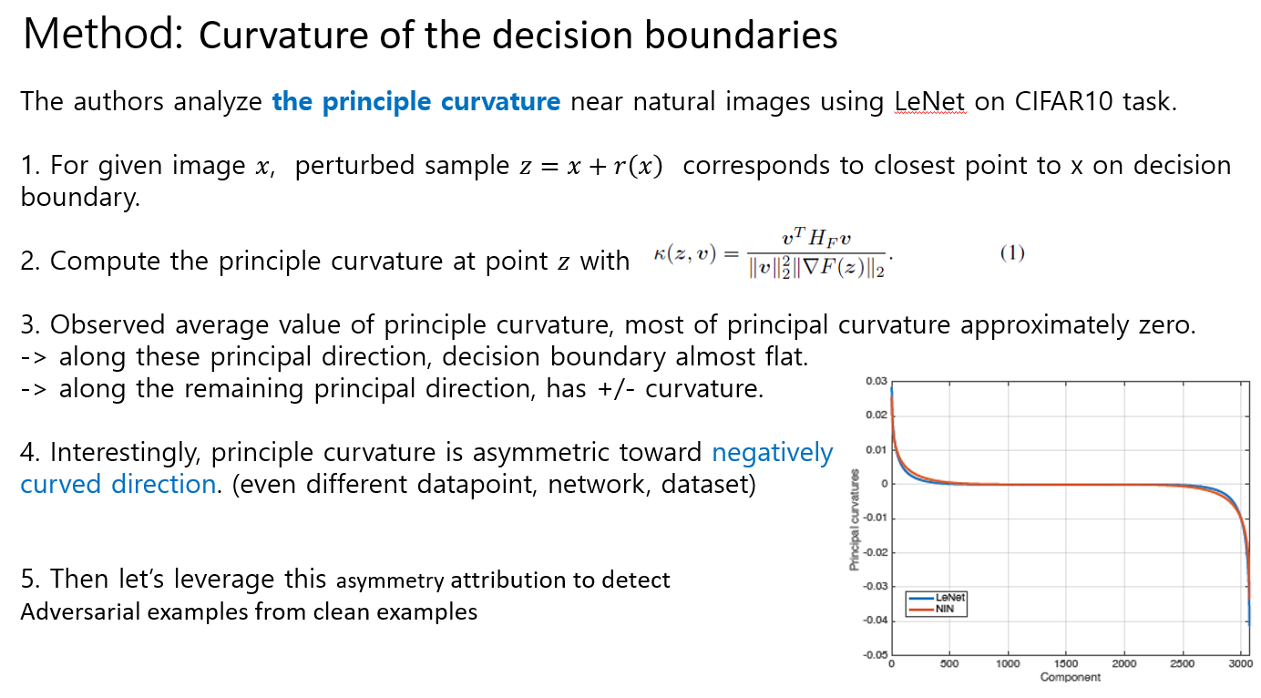 2. Decision boundary의 curvature(곡률)특성 : 곡률이 거의 평평한데 주요 몇(?)개 곡률이 그렇지 않음. 이 현상은 original sample과 perturbed sample이 방향이 다름.