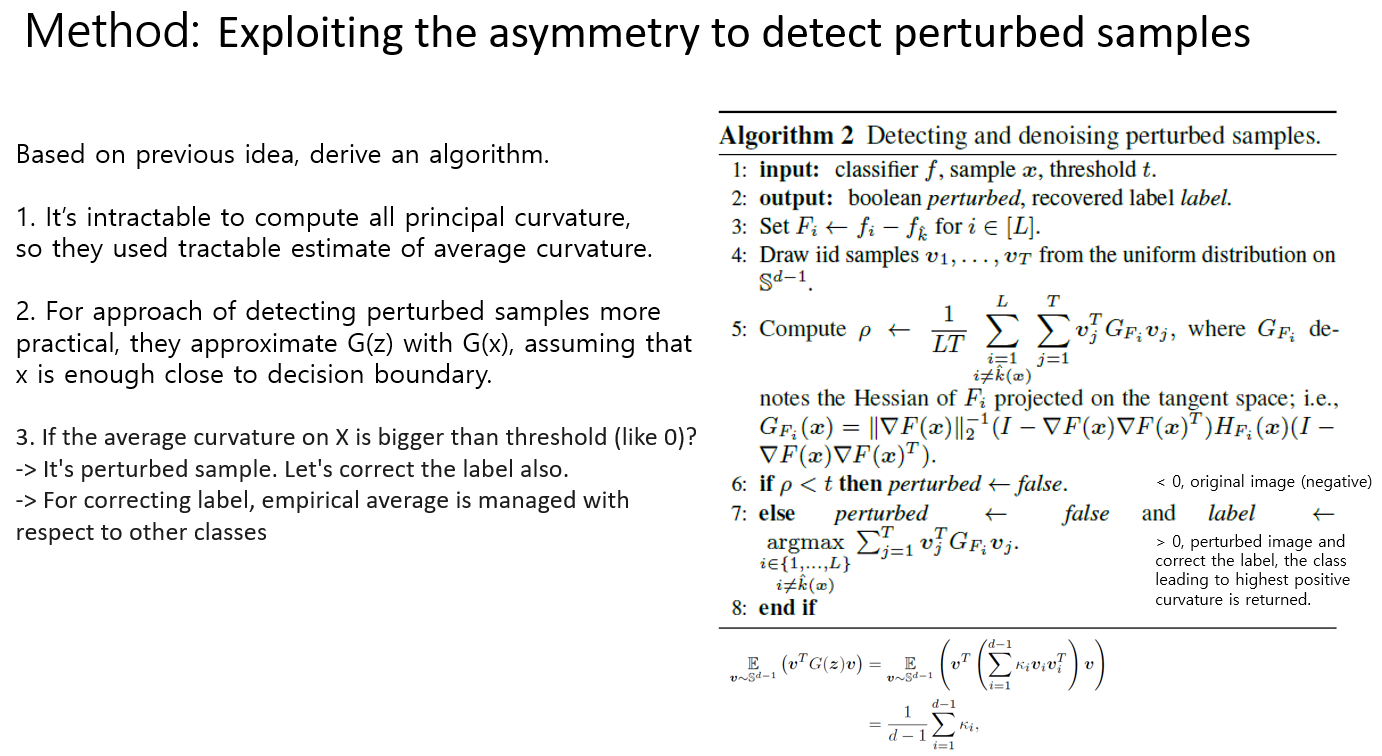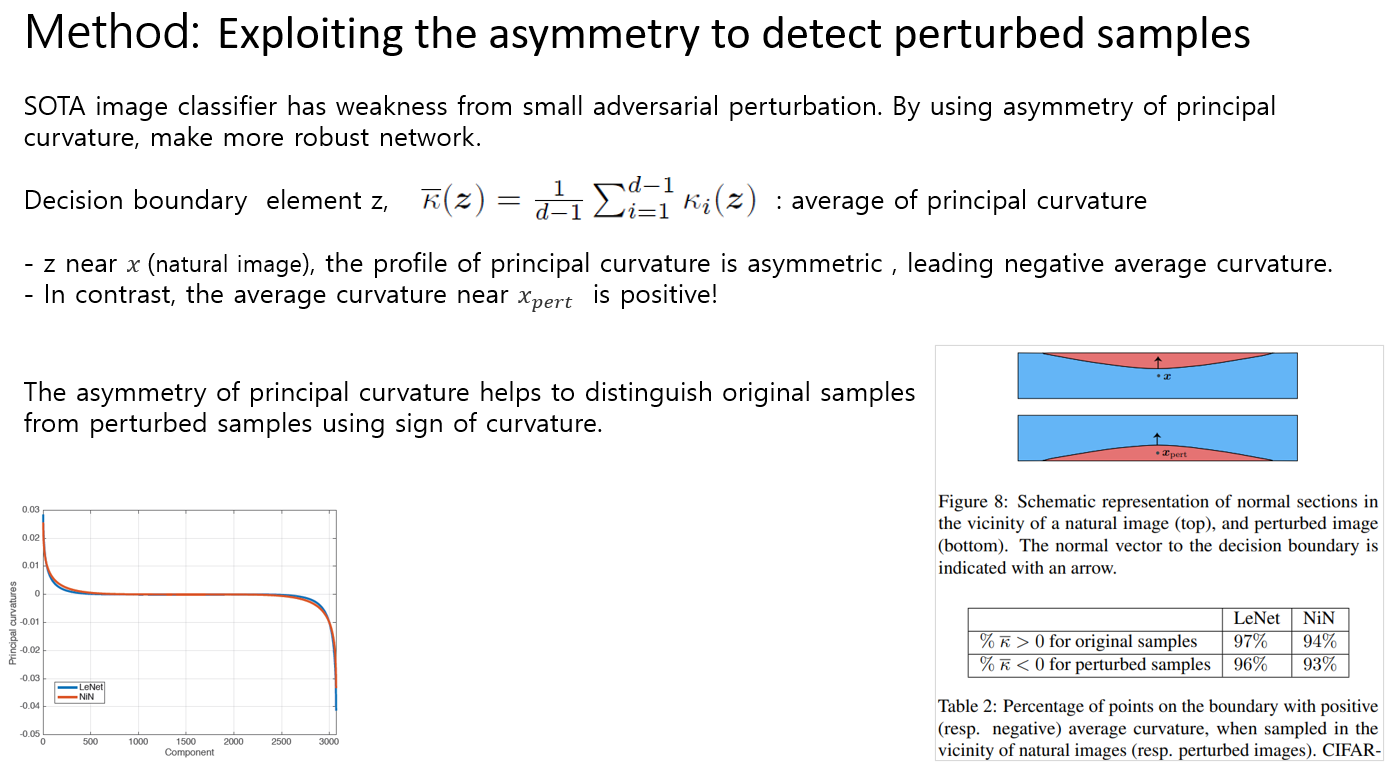 perturbed sample은 decision boundary가 + 쪽으로 싸고 있고, original sample은 decision boundary가 - 쪽으로 싸고 있는 현상을 우리는 발견했다. curvature의 principle component를 다 더했더니 이러한 현상을 발견한것이다. 따라서 이런 특성을 이용해서 decision boundary에 대한 curvature방향으로, 이 샘플이 orignal인지 pertrubed인지 더 잘 구분하는 더 robust한 network를 만들자.