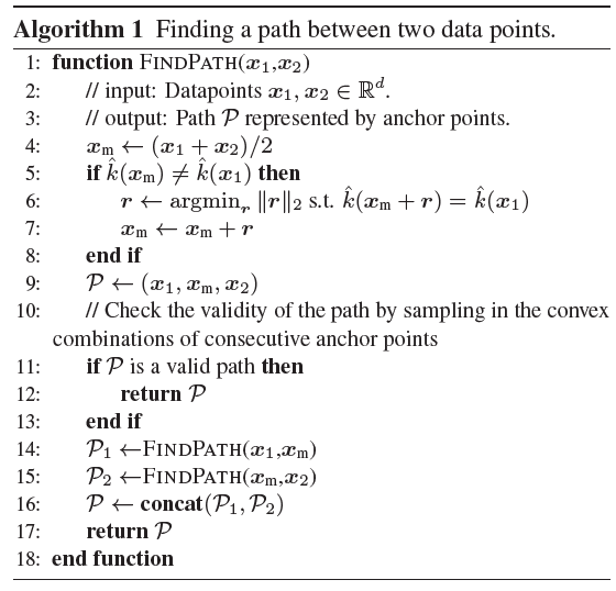 1. 영역이 연결되있음을 평가하기 위해 두 데이터셋(x1, x2) 사이 path를 찾는 알고리즘을 제안한다.