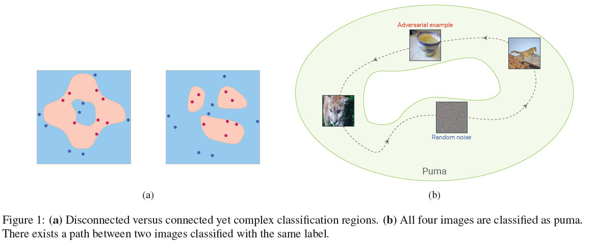 -> 해당 연구에서, 우리는 topology space 및 decision boundary로서의 classification 영역을 주로 볼것이다. 그리고 그들의 기하학적인 특성을 관찰한다. 먼저 1) classification regions (sota 뉴럴넷들로부터 유도되는) 을 보고, 2) 경험적 증거를 제공한다. 즉 same label이지만 두 data point일때의 관계를 보는 것임