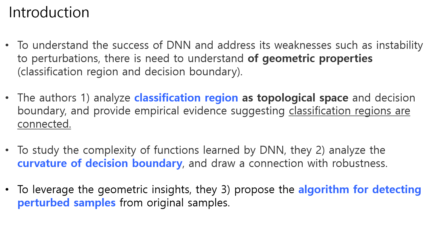 -> classification 영역과 decision boundary의 기하학성은 전통적인 classifier로부터 유도된다. 그러나 sota 뉴럴넷들에 대한 근본적 특성은 아직 알려져있지 않다. 그러나 뉴럴넷 성공을 이해하고 잠재적으로 그들의 취약성을 알아내기 위해 기하학적 특성의 이해는 원시적으로 남아있다.