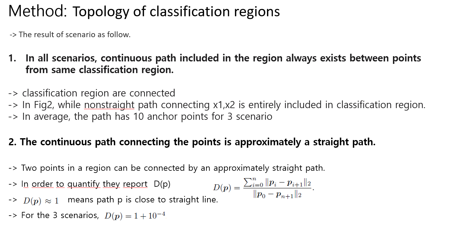 1. 모든 시나리오에서, 동일 class region의 두 point 사이에서, 해당 영역을 포함하는 연결된 path가 항상 존재한다는 증거는 힌트를 준다. 2. Moreover, 두 point를 연결하는 연결된 path는 대충 straight path 이다. 직선의 path엿다.... ![]() $D(p) $\approx$ 1 $ 이렇게 해서 straight path 에 가깝다고 한다. 그리고 3개의 시나리오에서 average deviation이 1+10-4 , which is slight deviation from straight path.. |