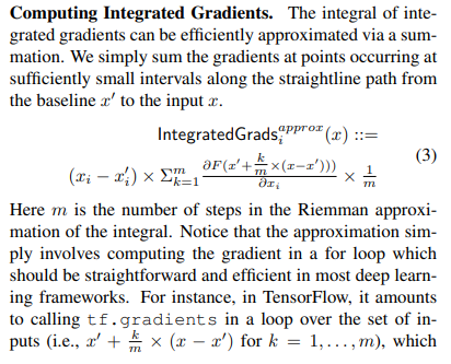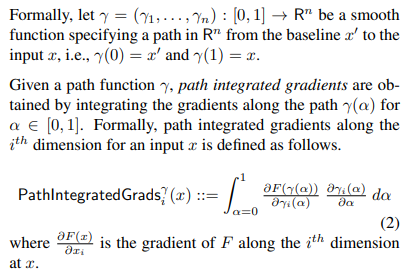 * baseline(일반적으로 black, white)에서 input 까지의 linear interpolation해서, 여러 gradient값들을 적분하는 방법으로 제안한다. 이렇게 모든 gradient 를 고려함으로써 특정지점에서 gradient가 0이되는 이슈를 해결함 *